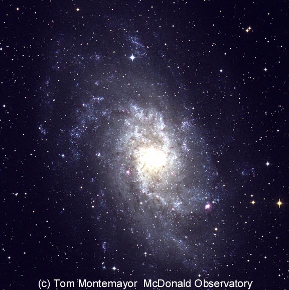 At a distance of 2.9 million light years, M33 is one of the three large spiral galaxies comprising the Local Group, our local cluster of galaxies (the other two being M31 and our own Milky Way galaxy). A spectacular spiral, several large hydrogen emission areas can be seen glowing pink in it's spiral arms.