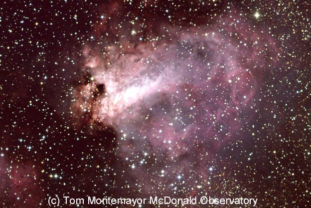 A spectacular object visible through any telescope, it lies amid the dense star clouds of Sagittarius. Roaming this area with low power will reveal glowing clouds of nebulousity, dark regions, star clusters and planetary nebulae. Along with Cygnus, one of the finest areas of the sky for spectacular viewing.