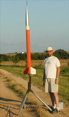 Jeff Cook with his semi-scale Aerobee-Hi before launch.