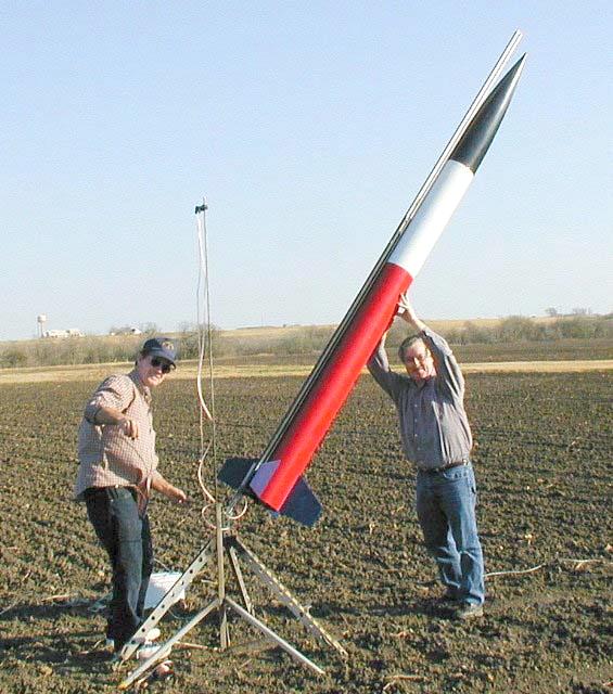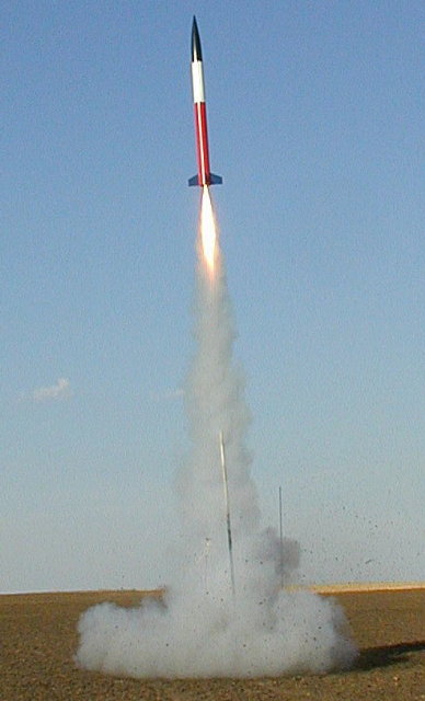 Liftoff! The huge rocket lifts off, powered by a K450 AN experimental motor and 2 G104s. Look at the dirt fly!