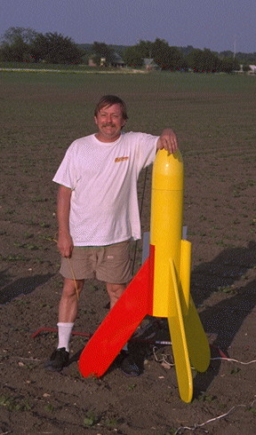 Rick Taylor poses with his giant upscale of the Estes Mosquito.