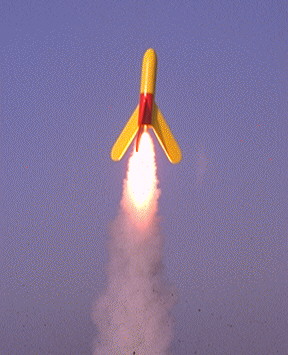 Liftoff! The giant Mosquito thunders upward powered by an Aerotech K550.
