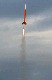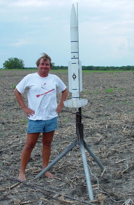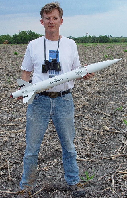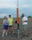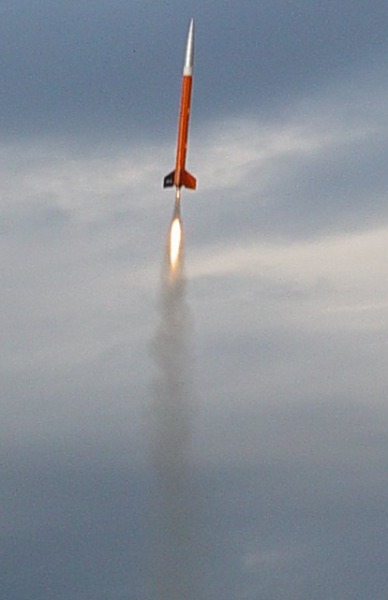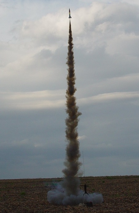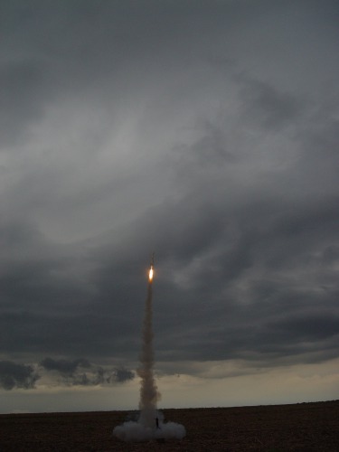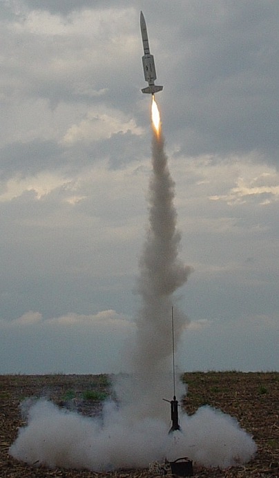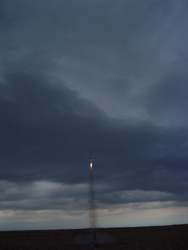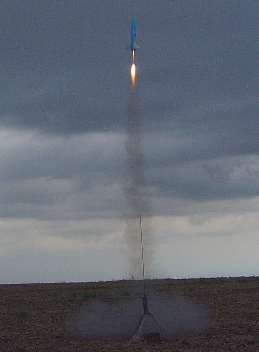 It should have been called "Storm Dance"!. Conditions didn't look very good; we had a ceiling around 3000 feet, winds around 10 mph and a line of thunderstorms approaching from the west. Nevertheless, a few of us fearless rocketeers preped our low fliers and had a successful launch. The storms hit around 7 o'clock so we shut down a little early, but it was a successful launch. And the sky and lightning show from the approaching thunderstorms was fantastic! Not all the flights were photographed; click on thumbnails for larger images.