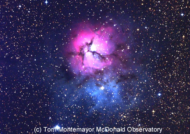 The Trifid is visible through binoculars as a bright condensation in the Milky Way. With a telescope, the three dark lanes become visible, though the blue reflection nebula is much tougher to see visually. Only one degree southeast of the Trifid lies M8, the Lagoon nebula, a much larger, naked eye object. Together, the two objects make a fine target for a wide field eyepiece.